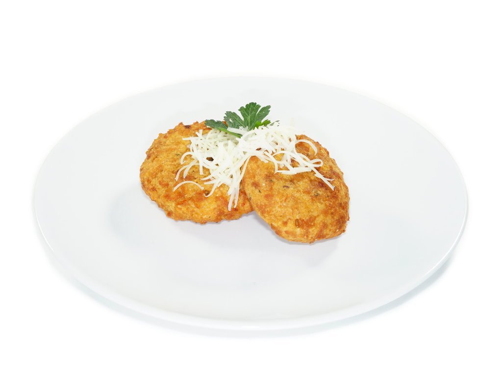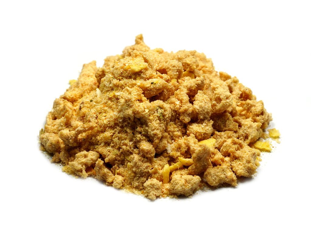 luštěninová směs min 54% (SOJOVÝ granulát, mouky: hrachová, cizrnová), bramborový škrob, bramborová kaše (99% sušené brambory, emulgátor: mono- a diglyceridy mastných kyselin, antioxidant: askorbylpalmitát, kurkuma), strouhanka kukuřičná (kukuřičná krupice, sladový výtažek, přírodní barvivo: uhličitan vápenatý), koření, sýrový prášek min 3% (SYROVÁTKA sušená, SÝR sušený, tavící sůl: fosforečnany sodné, aroma), sušená zelenina (česnek, cibule předsmažená (cibule, slunečnicový olej), cibule sušená, karotka, pastinák, CELER, libeček), jedlá sůl, cukr, kvasnicový extrakt, palmový tuk, SOJOVÝ bílkovinný hydrolyzát, cukr, aroma, HOŘČICE, dextroza